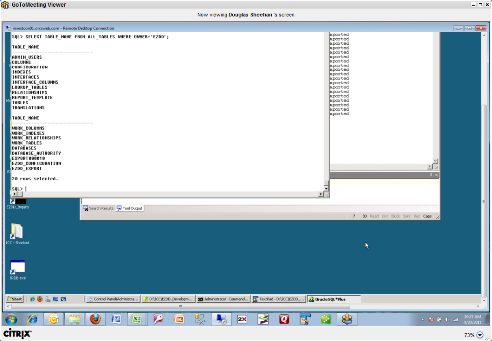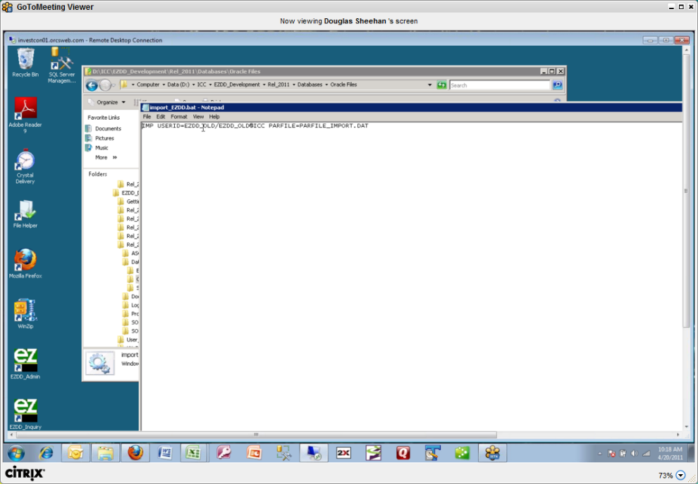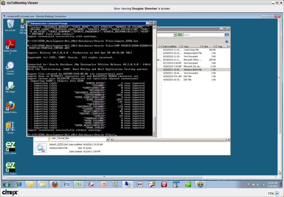 Now that the files have been reviewed and modified as required, the next step is to open a DOS window and run the import_EZDD.bat file from the Oracle_Files directory:
