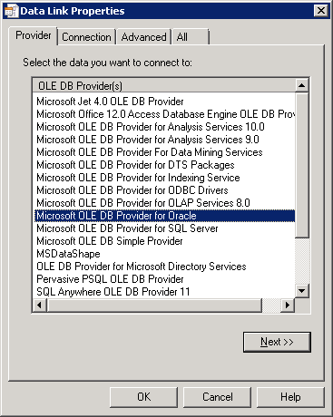 Next will appear the Data Link Properties screen, where Microsoft OLE DB Provider for Oracle can be selected, then click Next.