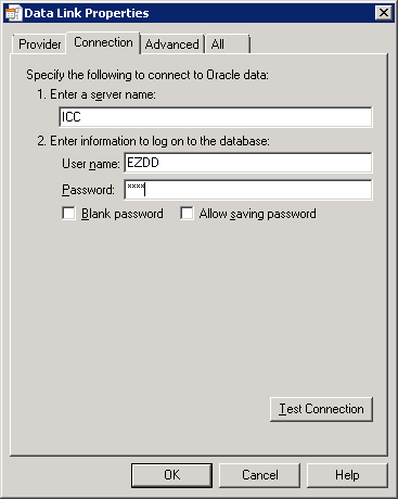 Next will appear the Connection tab. The name of the Oracle instance should be entered for the location of the EZDD Database (ICC in this example), and then the user code and password to be used when EZDD_Admin is run.