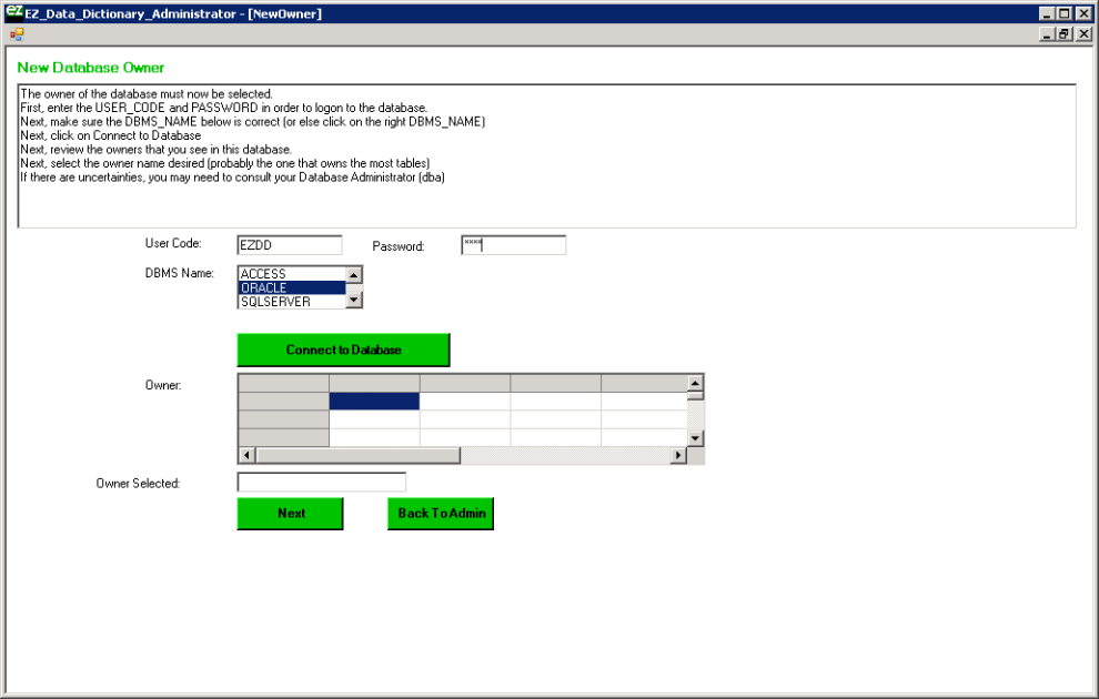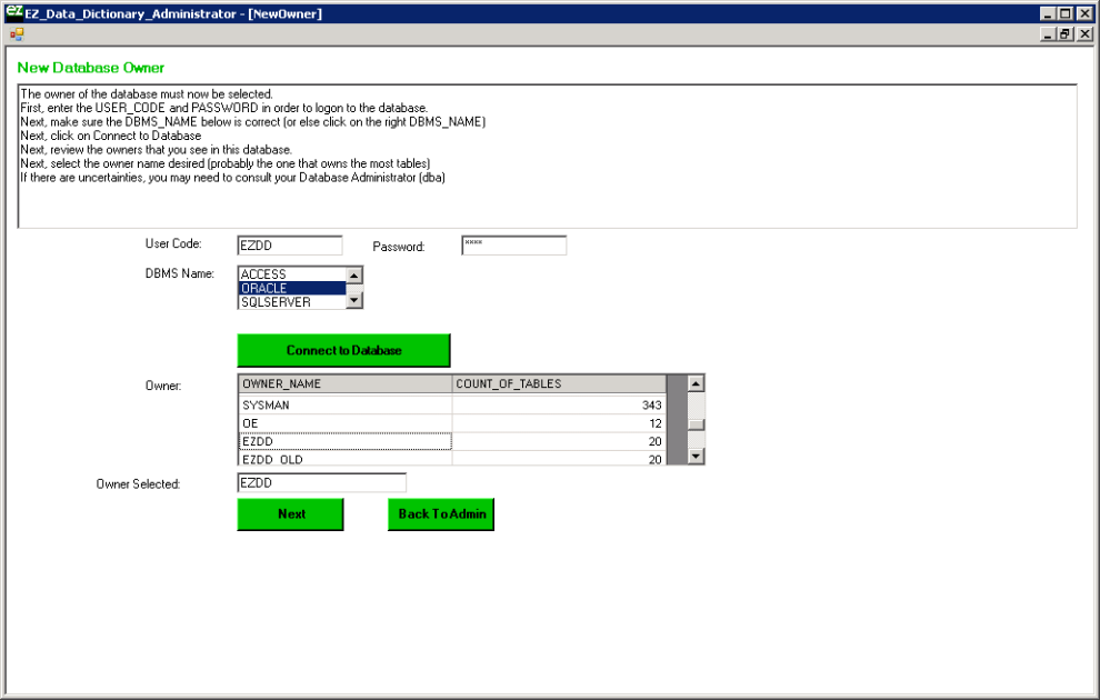 Select the owner of the EZDD tables (which is EZDD in our example), and when that owner appears in the text box, click Next:
